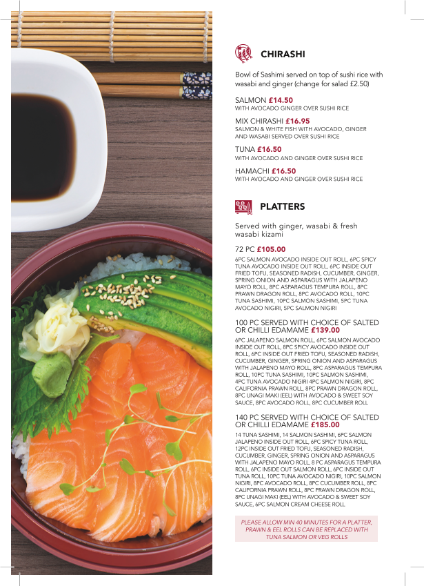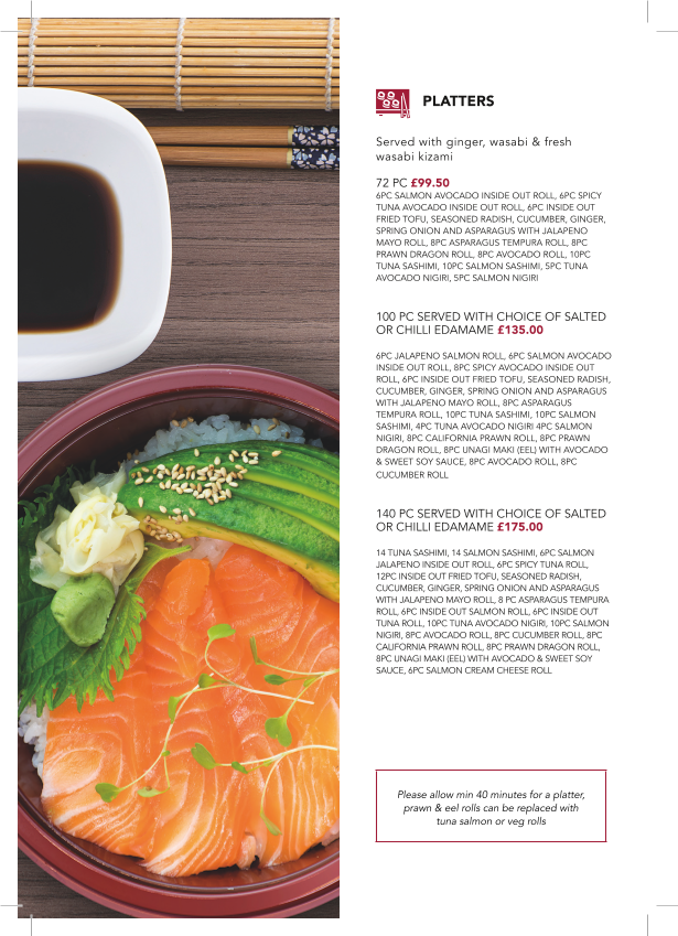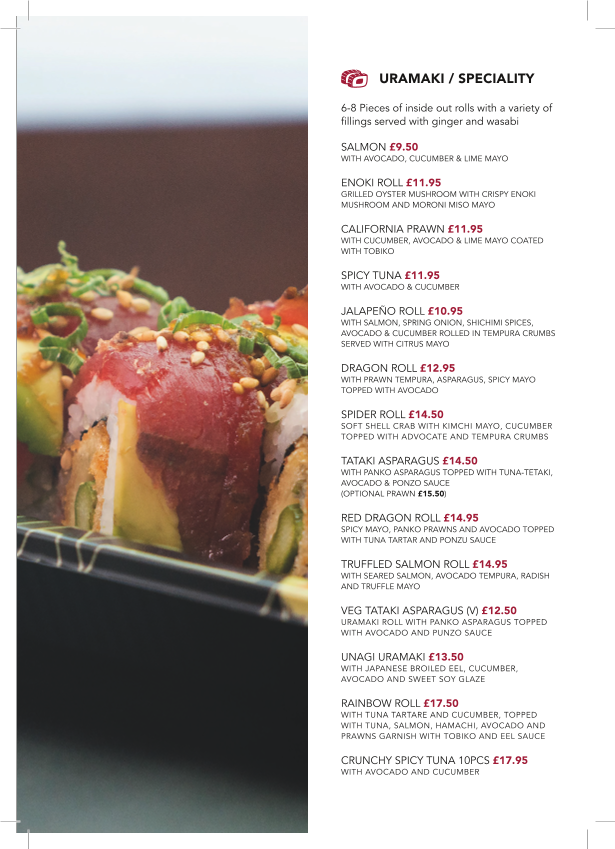 Inside out rolls, served with ginger and wasabi (6-8pcs). With prawn tempura, asparagus, spicy mayo topped with avocado (Optional asparagus panko) (vegetarian mayo)